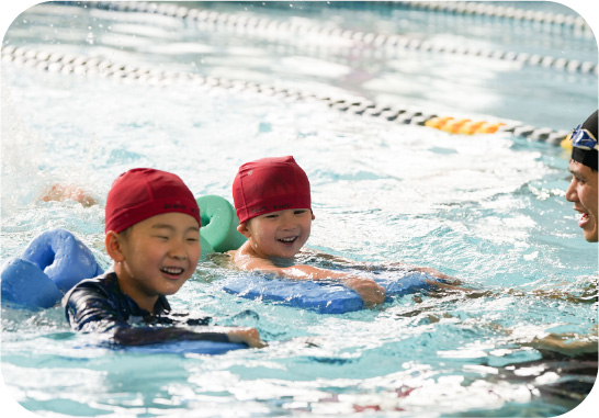 スイミングスクールへ行き、コーチや担任とともに水に触れ親しむ経験をします。楽しみながら潜る・バタ足など泳ぎの基礎も教えてもらいます。