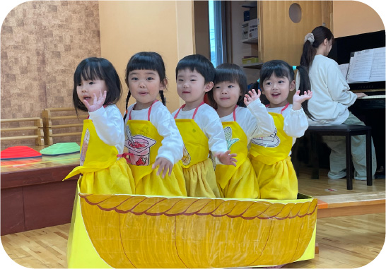 2歳児以上が参加です。歌や劇など自分たちのやりたいことを表現します。衣装を身に付けた姿は愛らしく、子どもたちも役になりきって頑張ります。発表会は平日と土曜の2日あります。